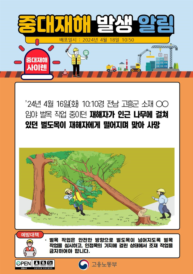 공유사항 : 벌목 작업 중 인근 나무에 걸쳐있던 벌도목에 피재자가 맞음