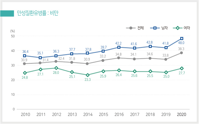 비만 단계가 진행할수록 정상 체중인 사람에 비해 고혈압이 동반될 위험이 남녀 각각 2.5배, 4배 더 높습니다.