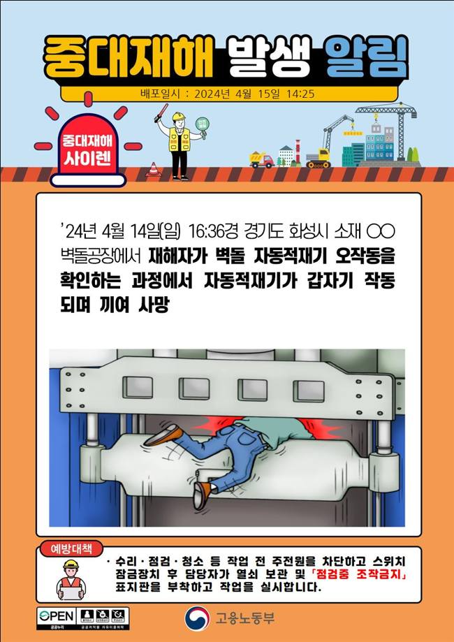 공유사항 : 피재자가 벽돌 자동적재기 오작동을 확인 하던중 자동적재기가 갑자기 작동되어 끼임