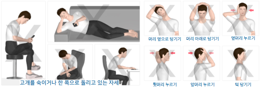 🐢 증상이 가벼운 경우에는 자세를 교정하면 호전될 수 있지만, 만성적으로 진행돼 통증이 심해지고 자세가 고정됐다면 의료기관에 방문하여 약물치료와 물리치료가 필요합니다. 증상을 완화하기 위한 약물치료 방법은 정립되어 있지 않지만 경험적으로 소염제, 진통제, 근이완제 등을 사용해 볼 수 있으며 통증이 심한 경우에는 경추부 근육이나 관절, 혹은 경추신경에 주사치료를 시도해 볼 수 있습니다.
