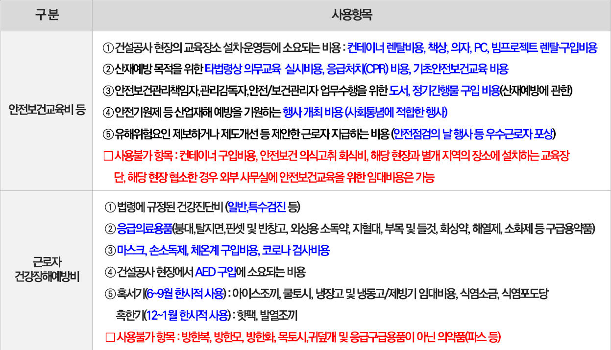 산업안전보건관리비 사용 가능 VS 불가능 항목 (2/2)