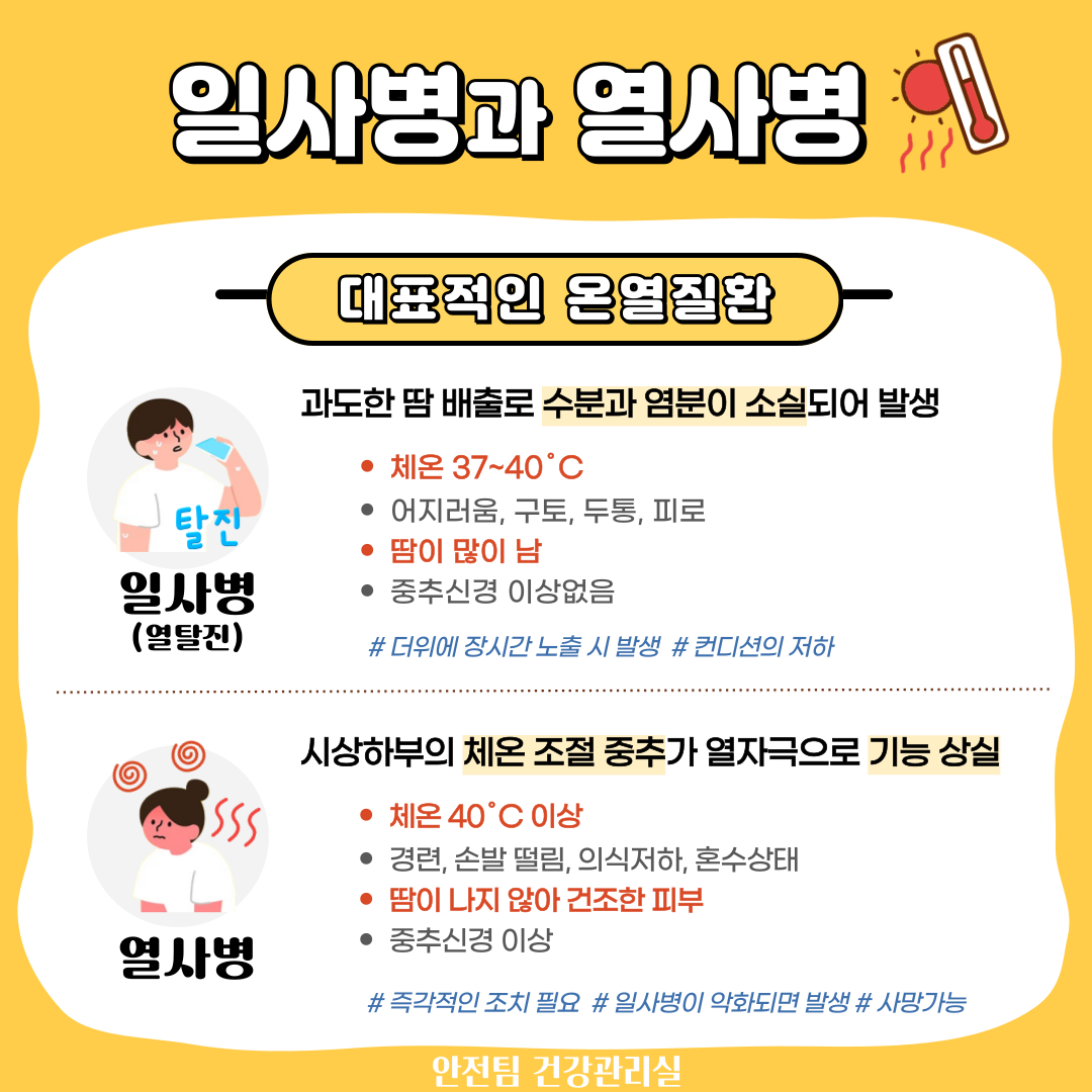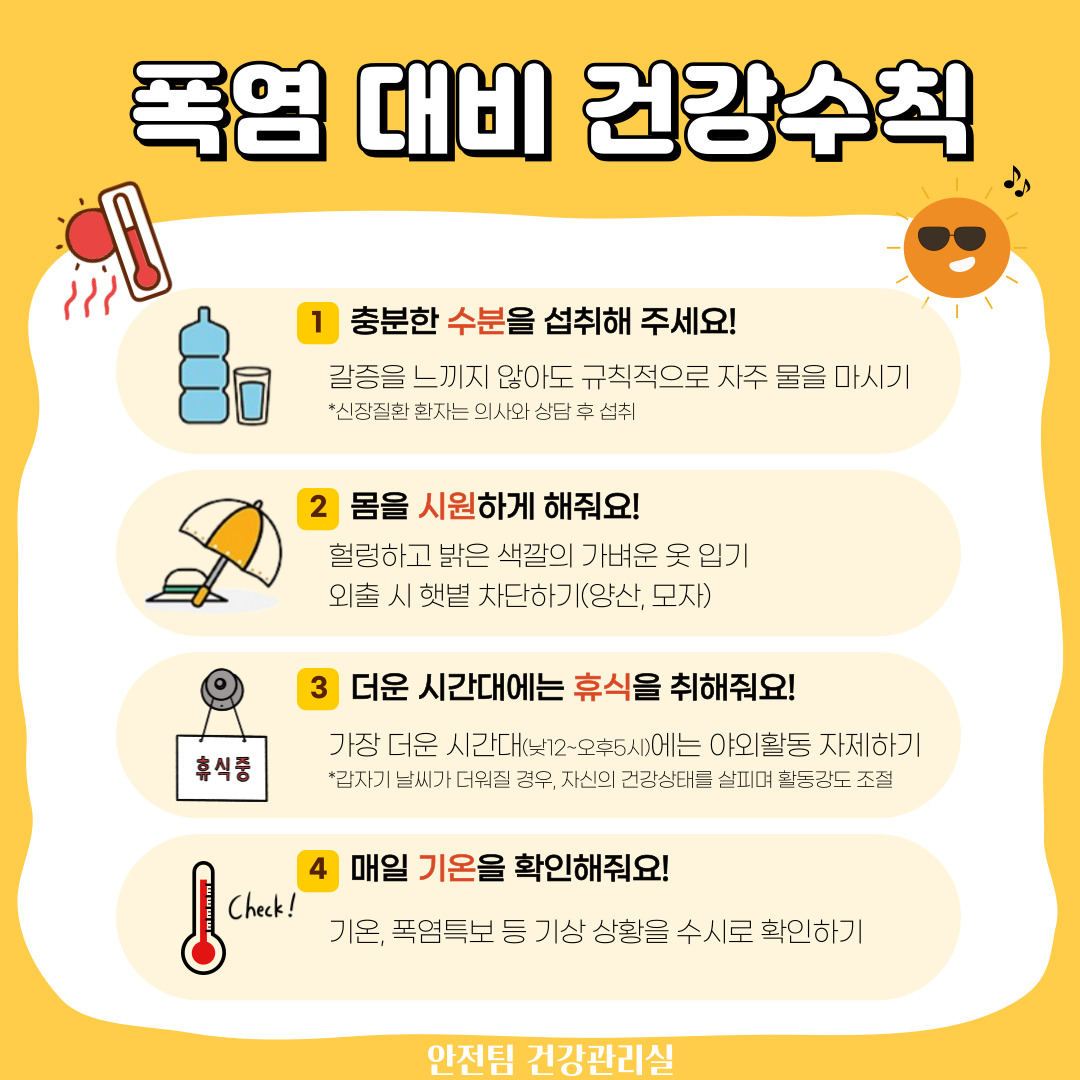 여름철 온열질환 예방수칙을 준수하여 안전하고 건강하게 여름철 보내시기 바랍니다.