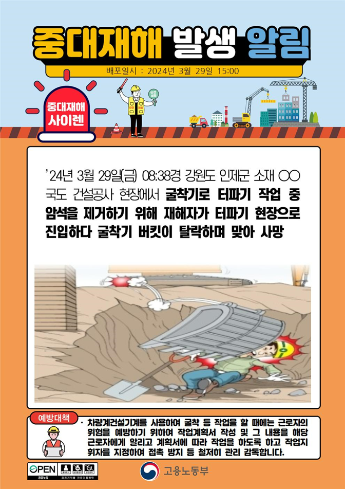 공유사항 : 굴착기로 터파기 작업 중 버킷이 탈락하여 암석 제거중인 피재자가 버킷에 맞음