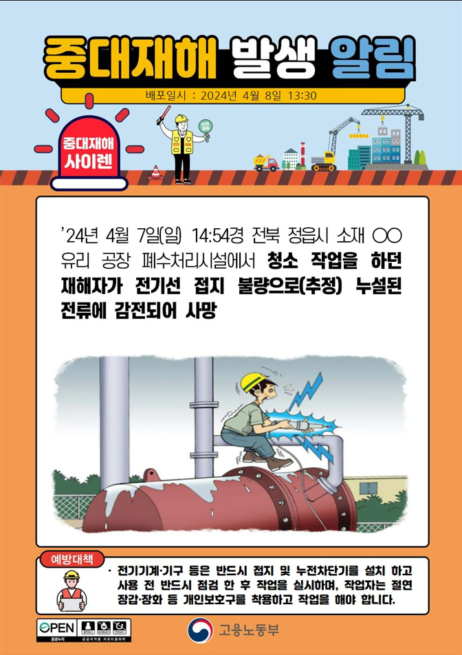 공유사항 : 유리공장 폐수처리시설 청소 작업 중인 피재자가 누설된 전류에 의해 감전
